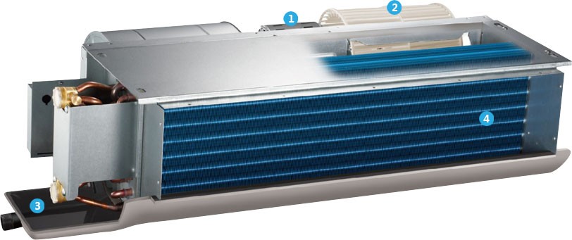 换热效率高,翅片与铜管一起贴合,增强导热性能,提高换热效率 运行宁静,采用低噪电机与大直径离心风轮,稳定宁静运转 机身薄,薄机身 设计,节省吊顶空间,灵活满足个性化需求 控制灵活,可独立控制各个房间
